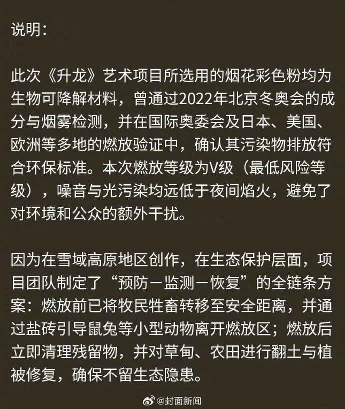 现场视频显示,蔡国强通过火药爆破在山脊点燃三幕烟花,形成“升龙”动态景观。