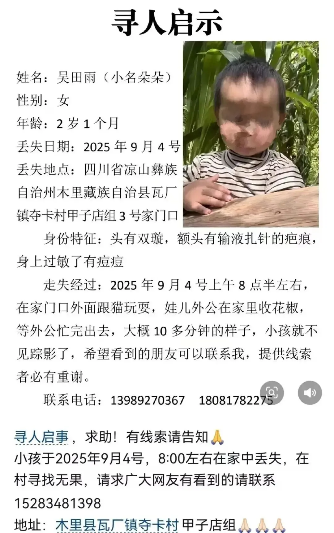 2岁女童朵朵在家门口失踪后,家人发布寻人启事,显示小女孩名叫吴田雨(小名朵朵),年龄2岁1个月。9月4日上午8点半左右,在凉山木里县瓦厂镇夺卡村甲子店组3号家门口走失。家属称,朵朵在家门口跟猫玩耍。大概10多分钟,等外公忙完出去,小孩就不见踪影了。